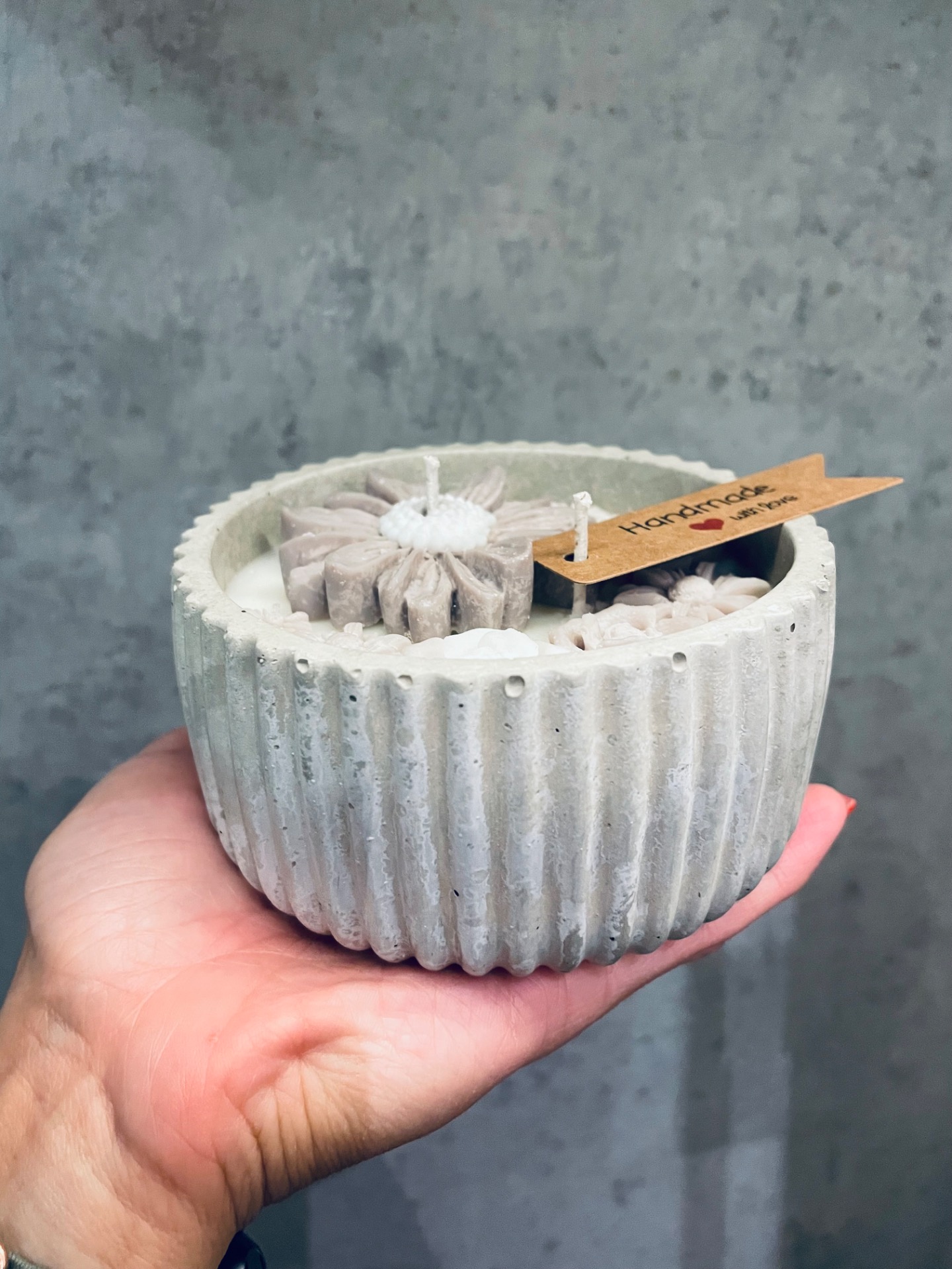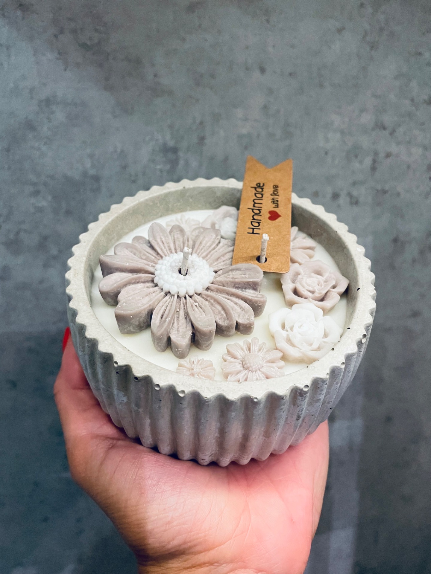 Sojová svíčka z veganského vosku v ručně vyrobené betonové formě. Forma je ošetřena nehořlavým matným lakem. Svíčka má dva bavlněné knoty. Květinové dekorace v odstínu mauve v kombinaci s krémovým odstínem čistého vosku.