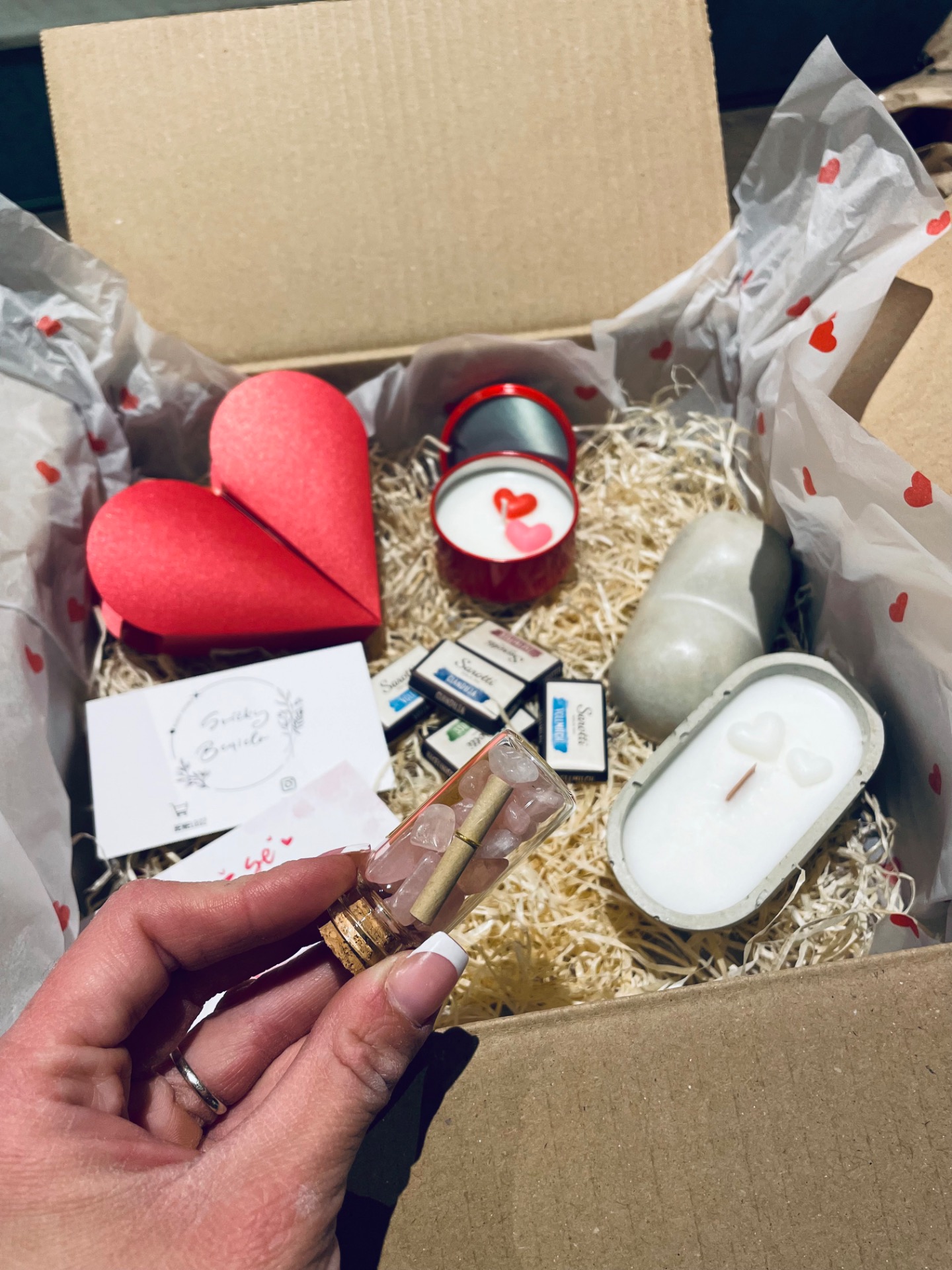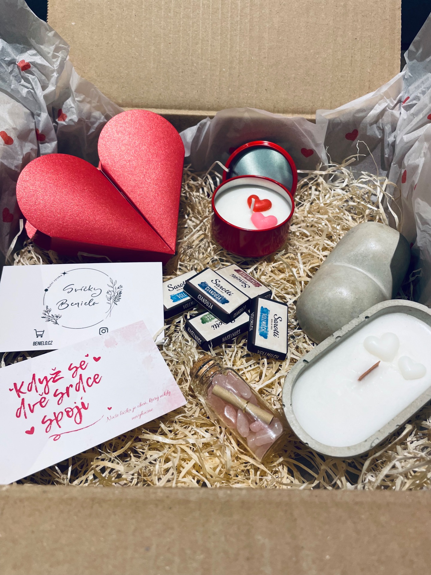Smyslný dárkový balíček vytvořený pro chvíle, kdy chcete říct miluji tě beze slov. Kombinace ruční práce, vůní, symboliky lásky a jemného luxusu potěší srdce i smysly.