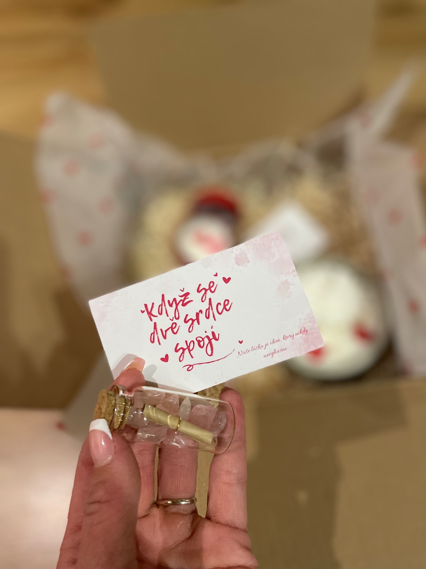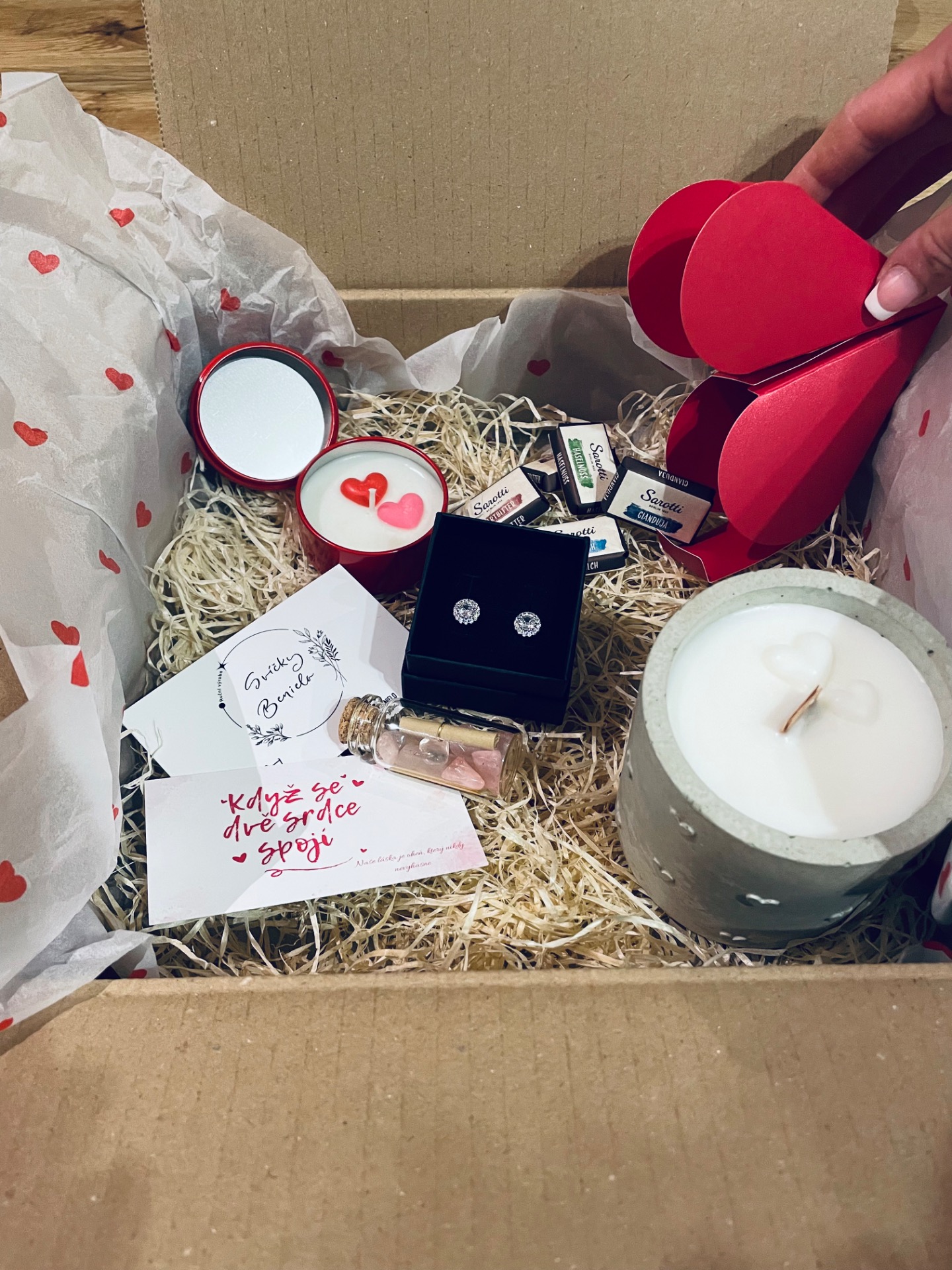 Smyslný dárkový balíček vytvořený pro chvíle, kdy chcete říct miluji tě beze slov. Kombinace ruční práce, vůní, symboliky lásky a jemného luxusu potěší srdce i smysly.