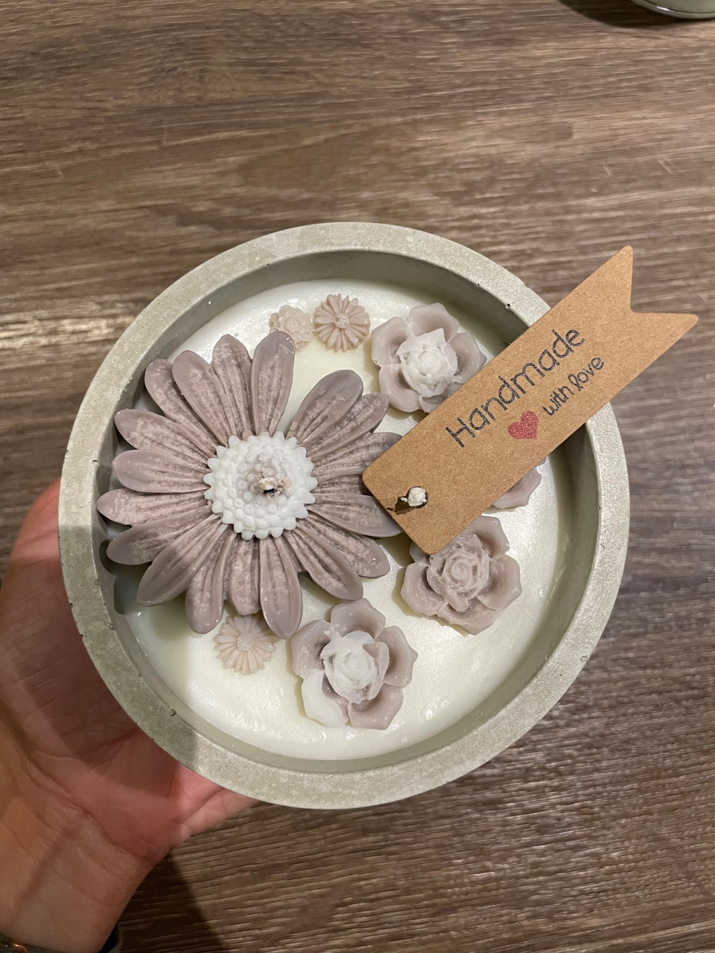 Sojová svíčka z veganského vosku v ručně vyrobené betonové formě. Forma je ošetřena nehořlavým matným lakem. Svíčka má dva bavlněné knoty. Květinové dekorace v odstínu mauve v kombinaci s krémovým odstínem čistého vosku.