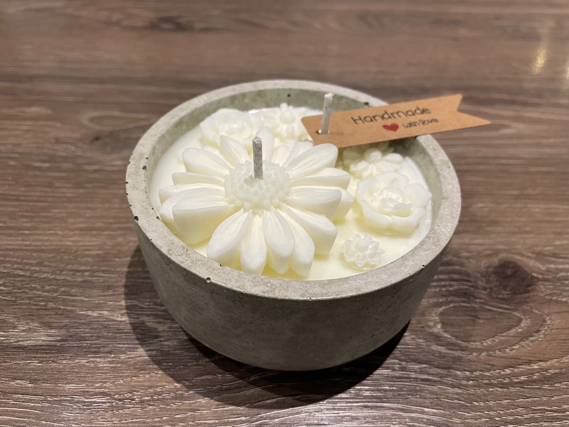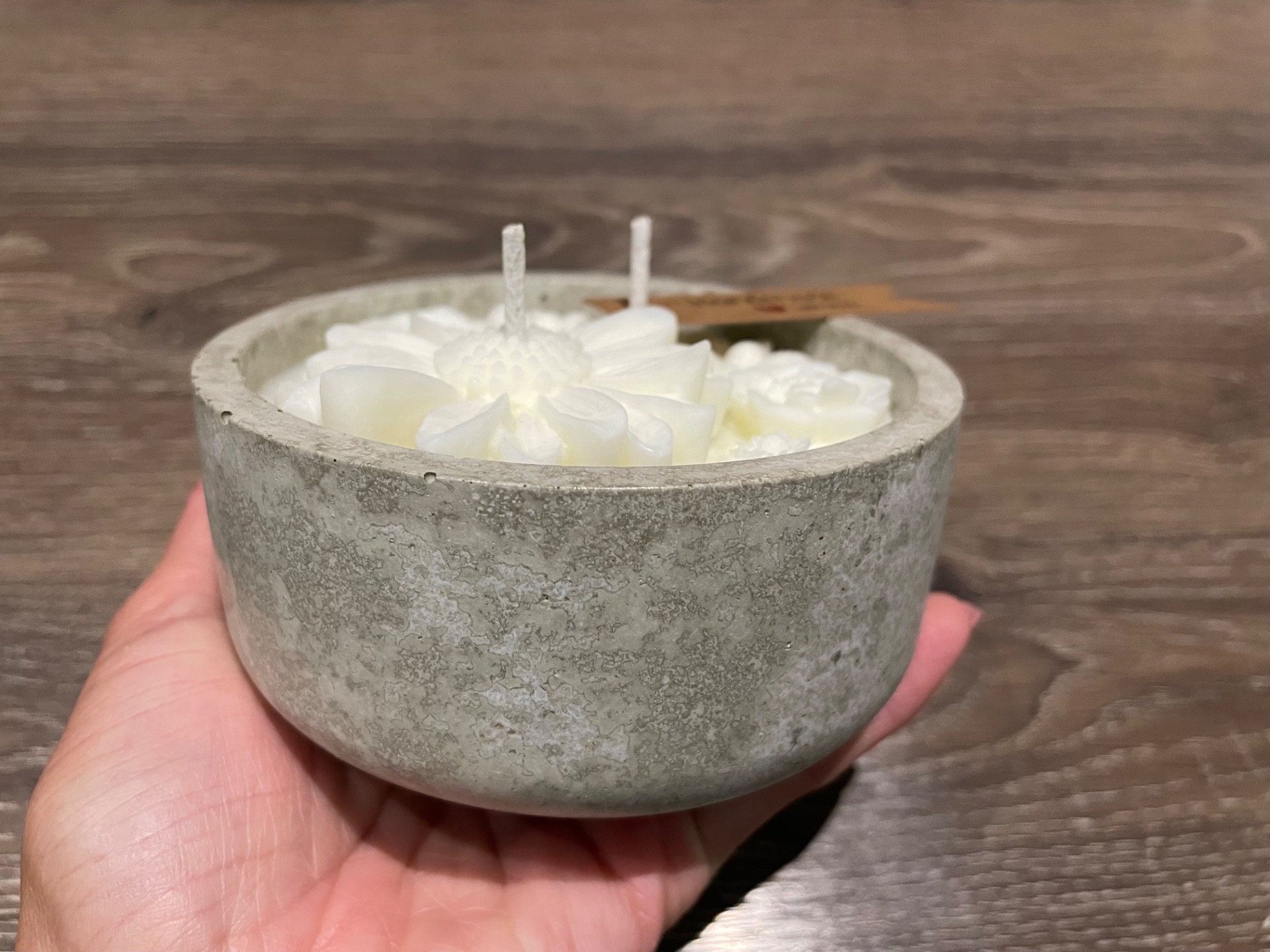 Sojová svíčka z veganského vosku v ručně vyrobené betonové formě. Forma je ošetřena nehořlavým matným lakem. Svíčka má dva bavlněné knoty. Květinové dekorace v odstínu mauve v kombinaci s krémovým odstínem čistého vosku.