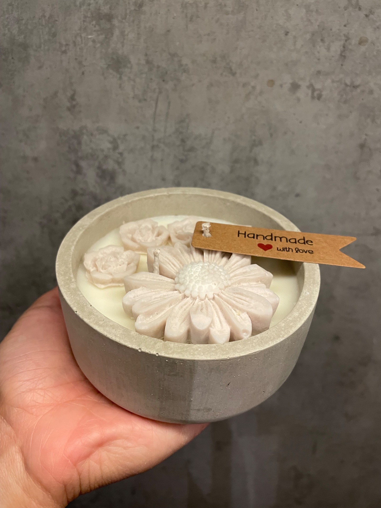 Sojová svíčka z veganského vosku v ručně vyrobené betonové formě. Forma je ošetřena nehořlavým matným lakem. Svíčka má dva bavlněné knoty. Květinové dekorace v odstínu belge v kombinaci s krémovým odstínem čistého vosku.