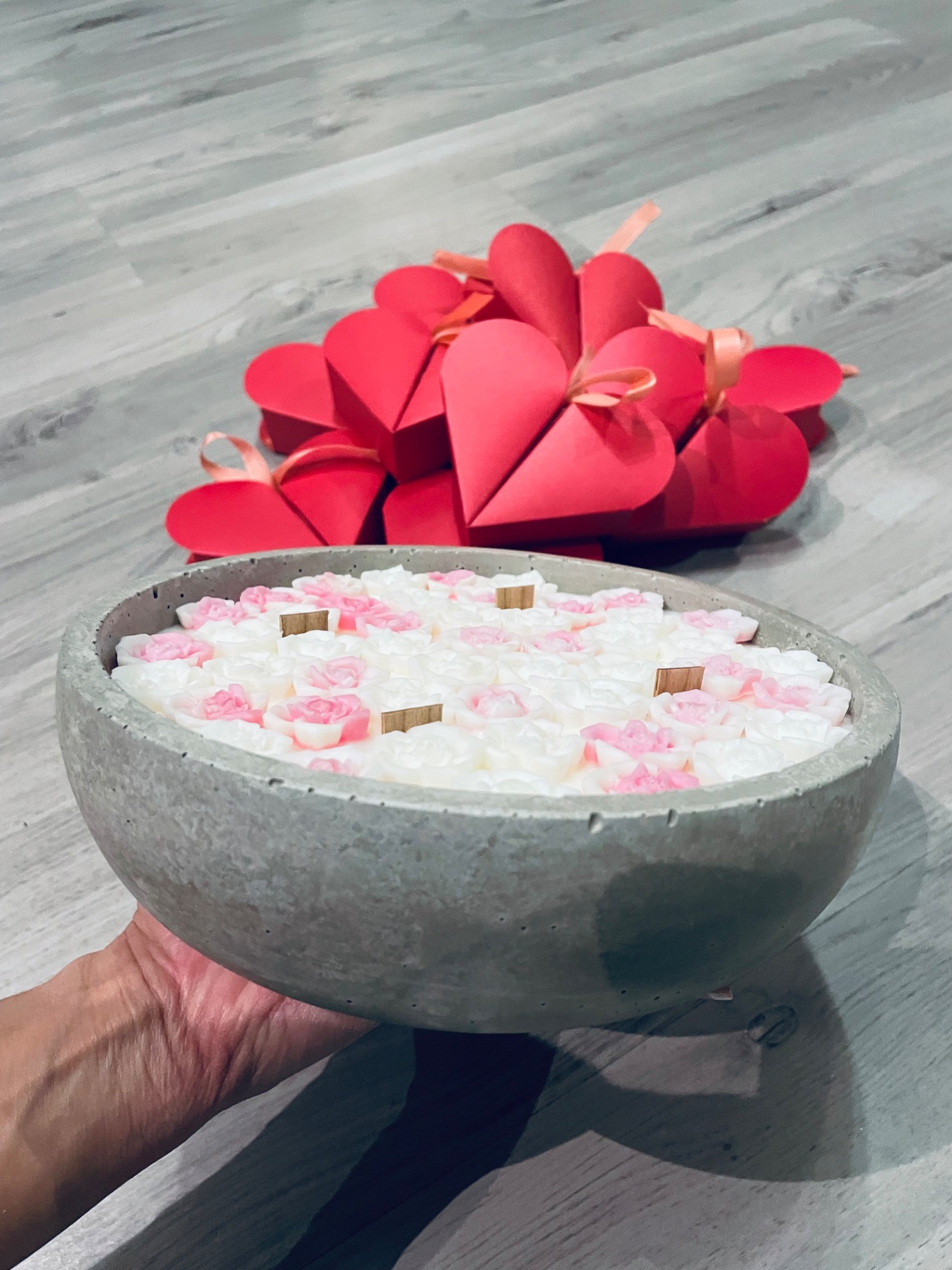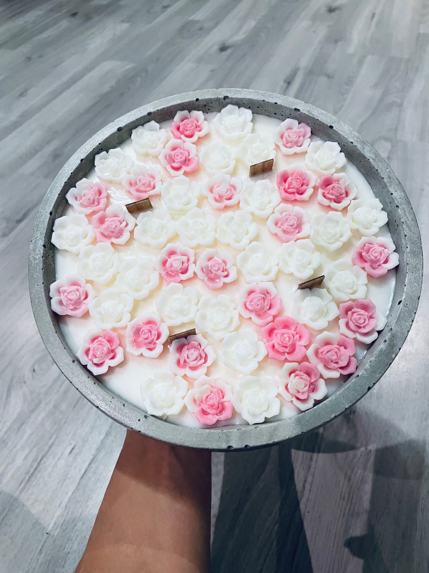 Betonová svíčka s jemným dekorem růže v růžových odstínech. 🤍