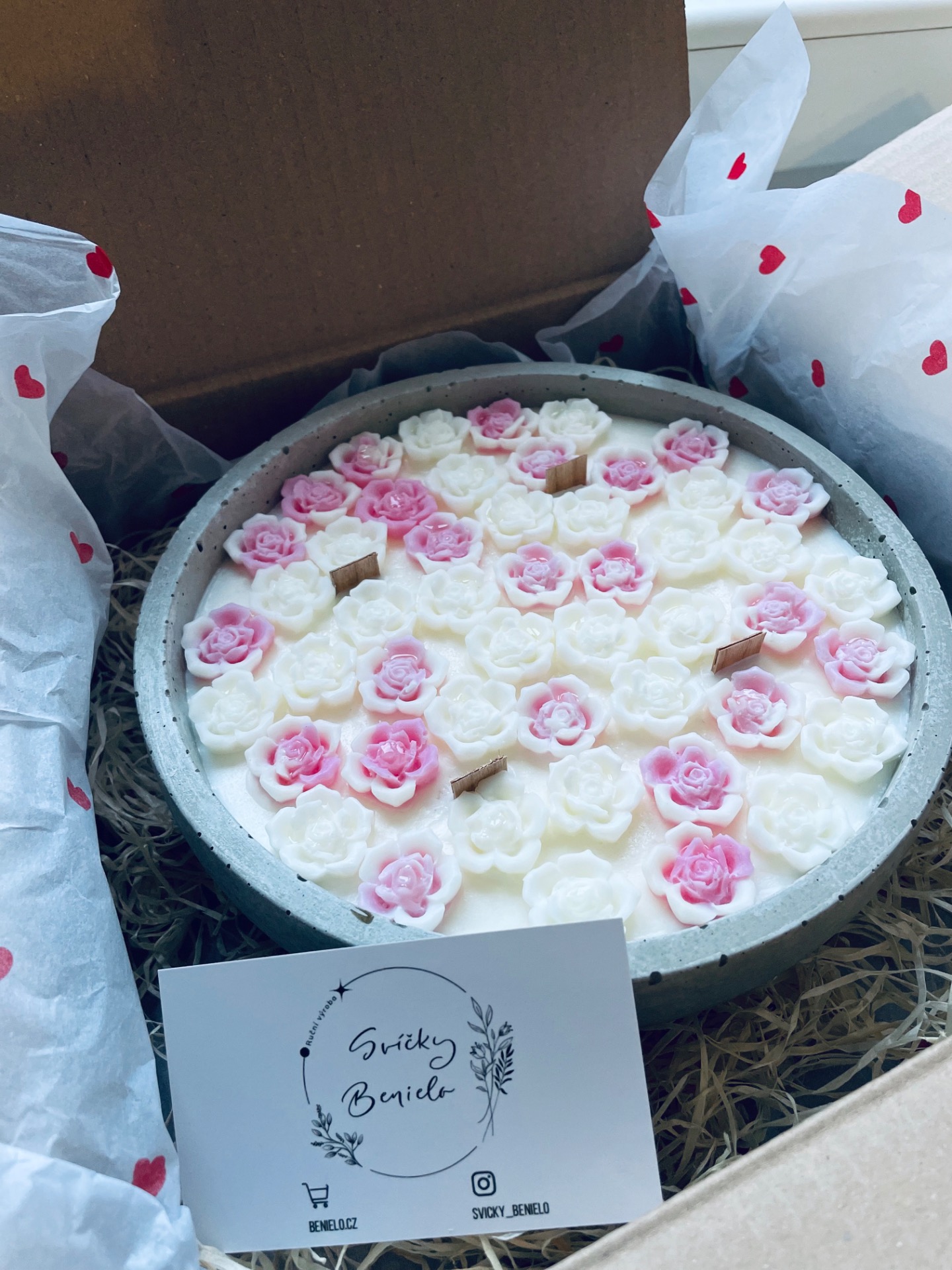 Svíčka je zabalena v dárkovém balení, připravená potěšit srdce i smysly.