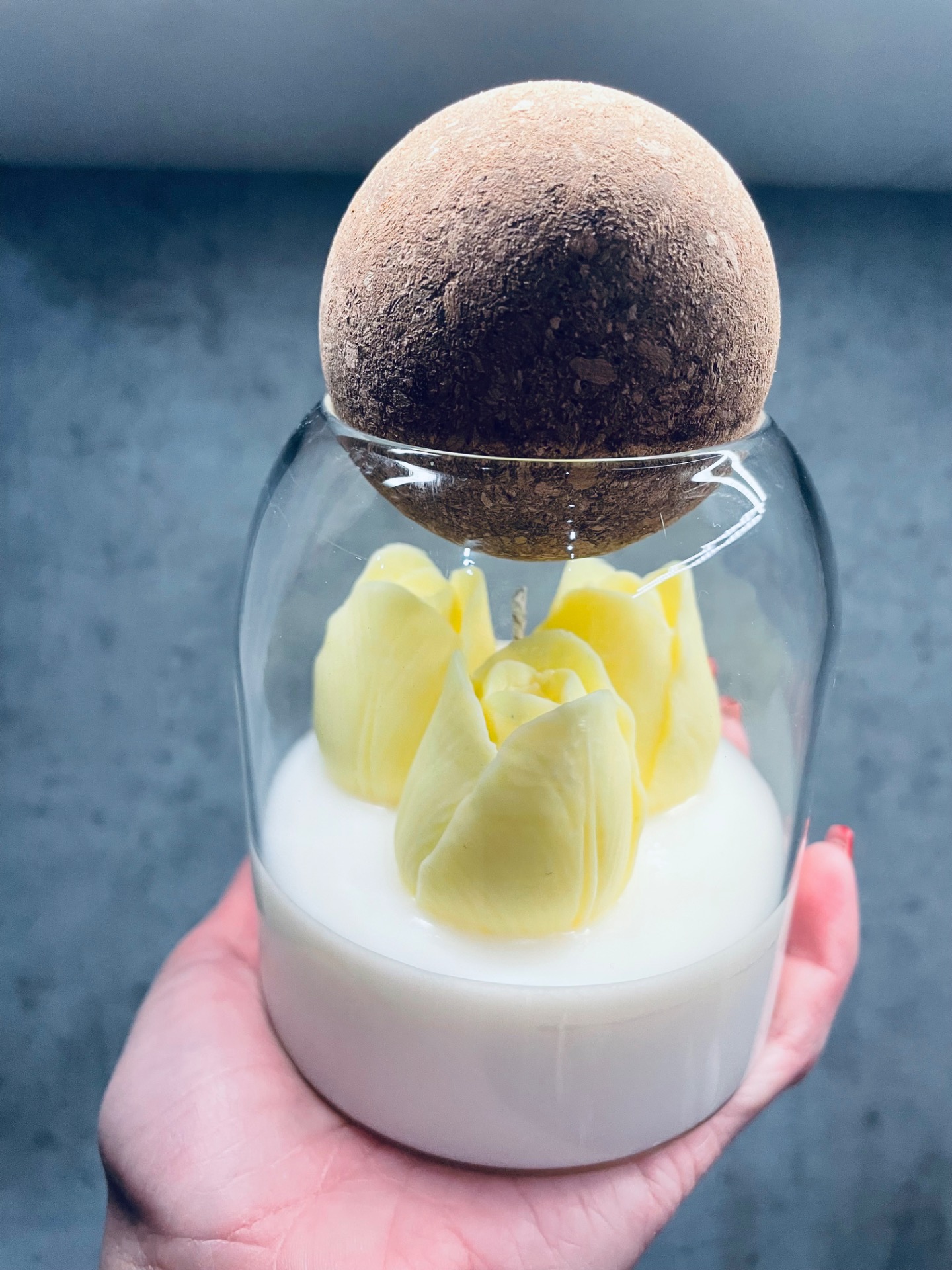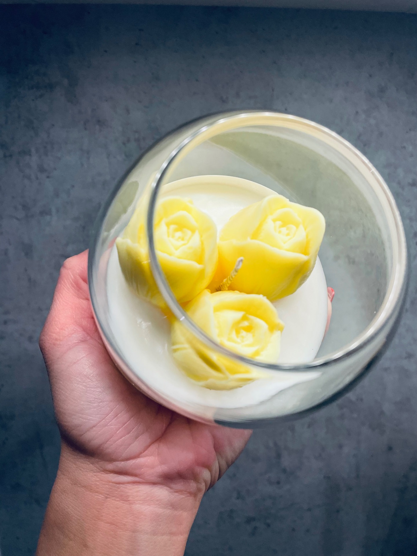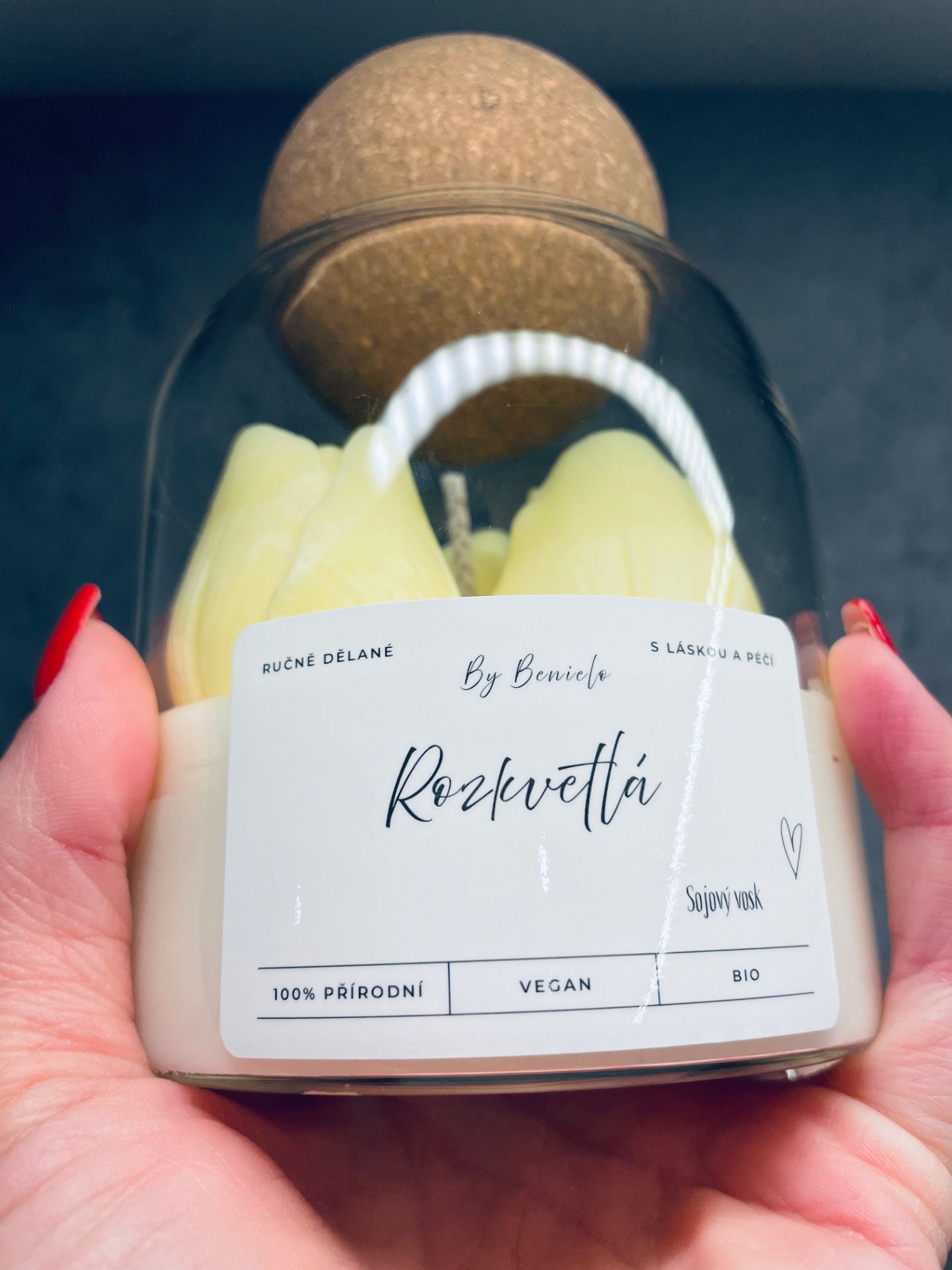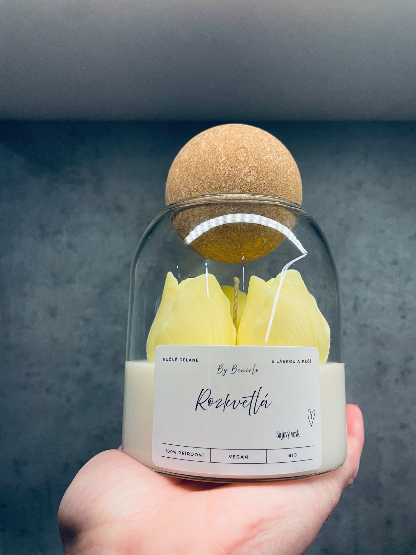 Designová sojová svíčka se třemi žlutými tulipány ve skleněné formě s kulatým korkovým víčkem. Jemná na pohled, silná svým významem.
