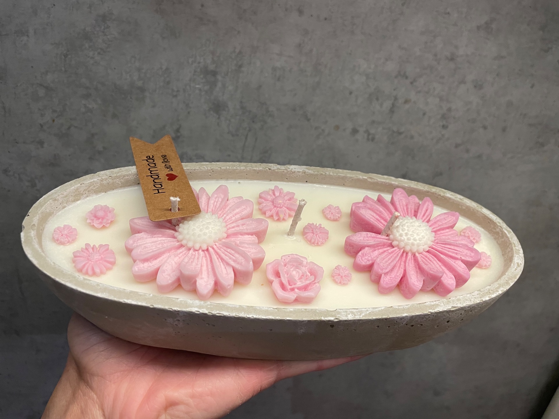Sojová svíčka z veganského vosku v ručně vyrobené formě z modelářského betonu. Forma je ošetřena nehořlavým matným lakem. Svíčka má tři bavlněné knoty. Květinové dekorace v odstínu pink v kombinaci s krémovým odstínem čistého vosku.