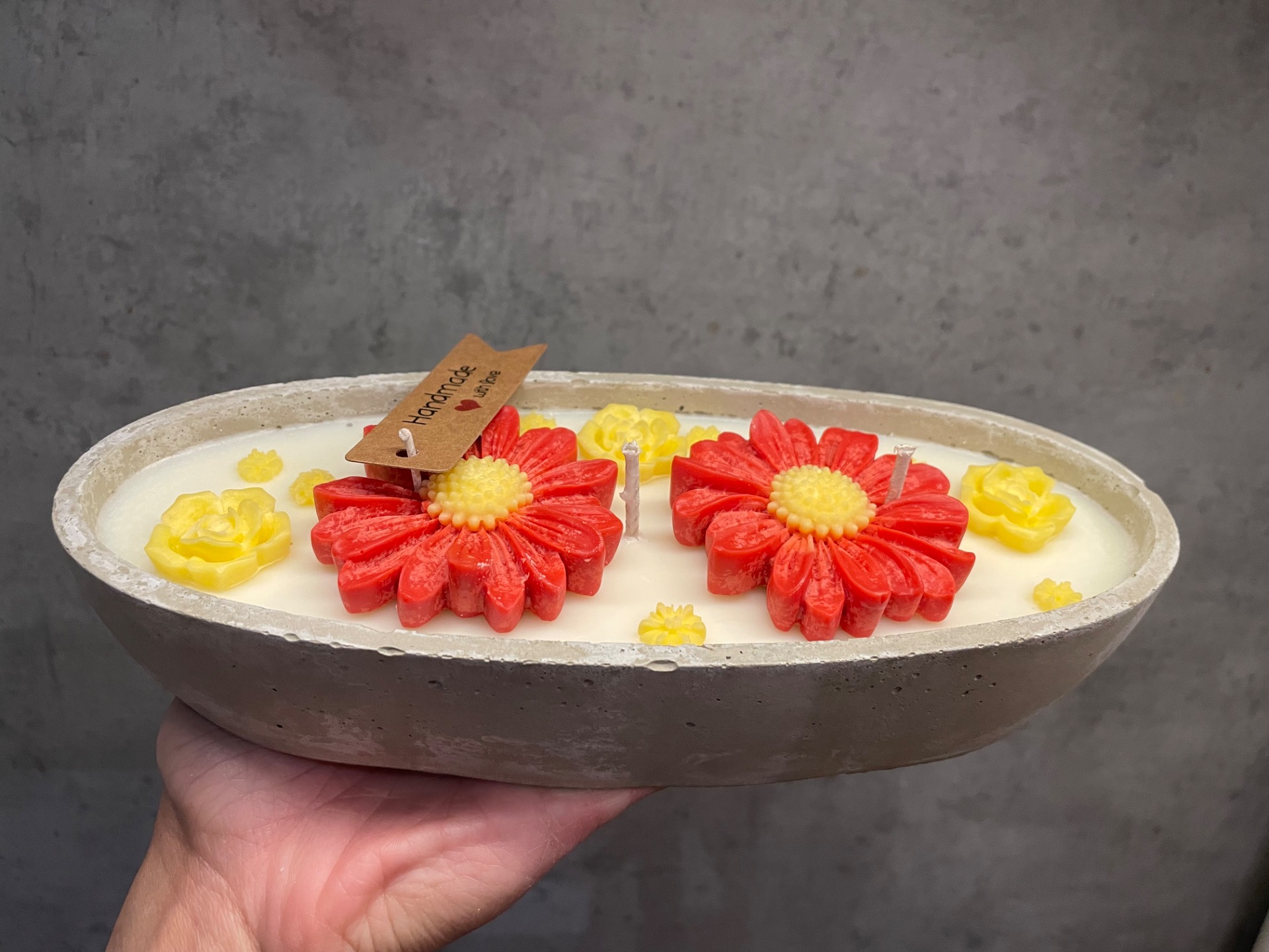 Sojová svíčka z veganského vosku v ručně vyrobené formě z modelářského betonu. Forma je ošetřena nehořlavým matným lakem. Svíčka má tři bavlněné knoty. Květinové dekorace v odstínu red a yellow v kombinaci s krémovým odstínem čistého vosku.