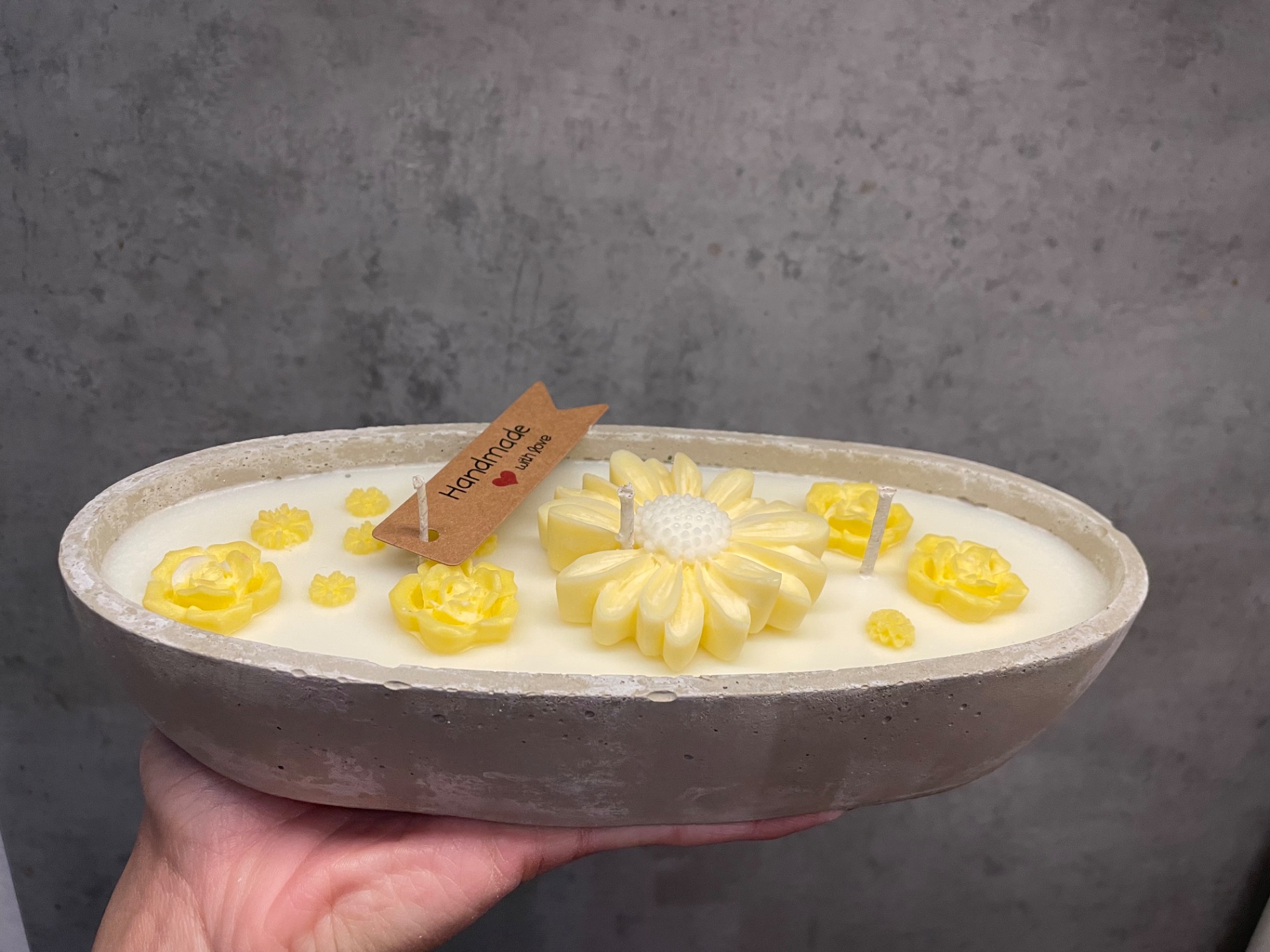 Sojová svíčka z veganského vosku v ručně vyrobené formě z modelářského betonu. Forma je ošetřena nehořlavým matným lakem. Svíčka má tři bavlněné knoty. Květinové dekorace v odstínu yellow v kombinaci s krémovým odstínem čistého vosku.
