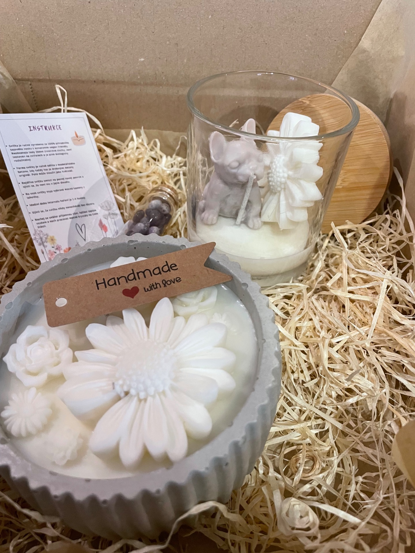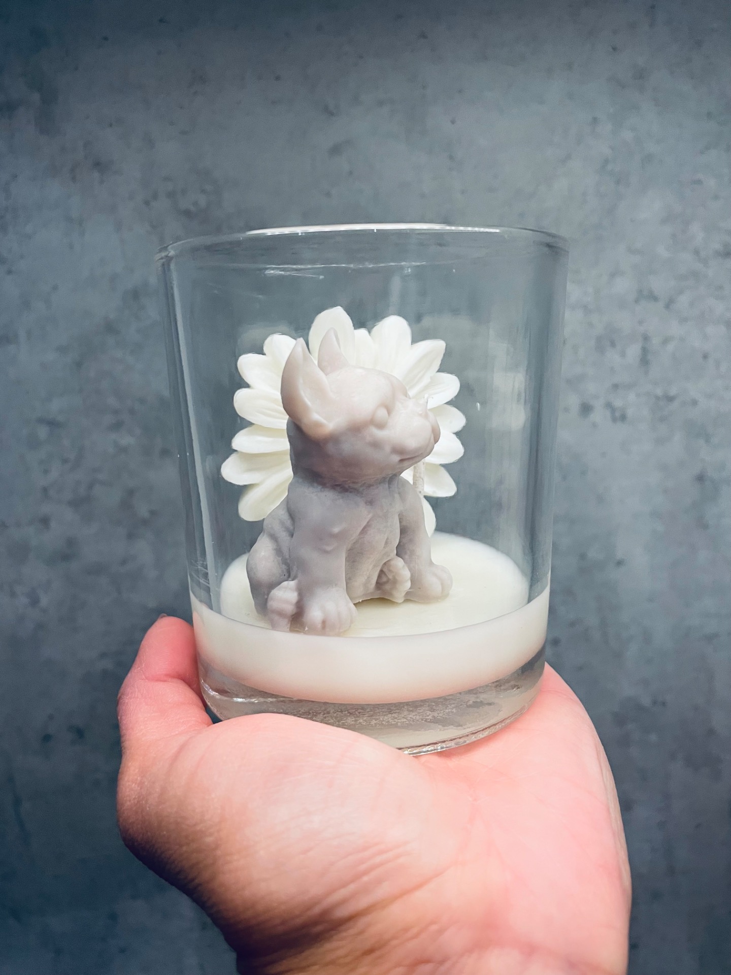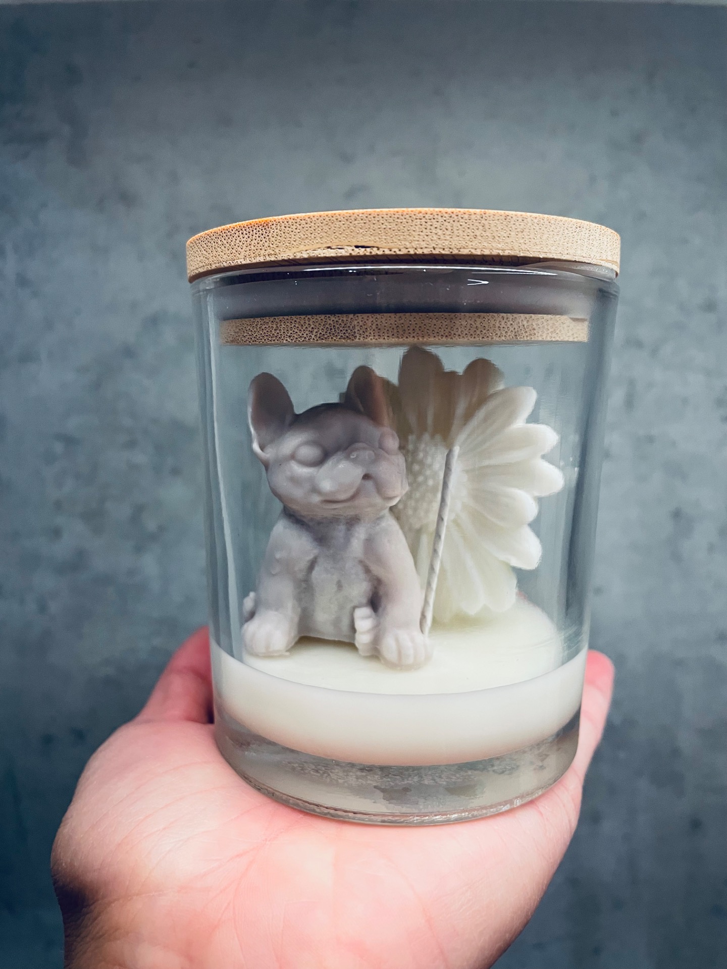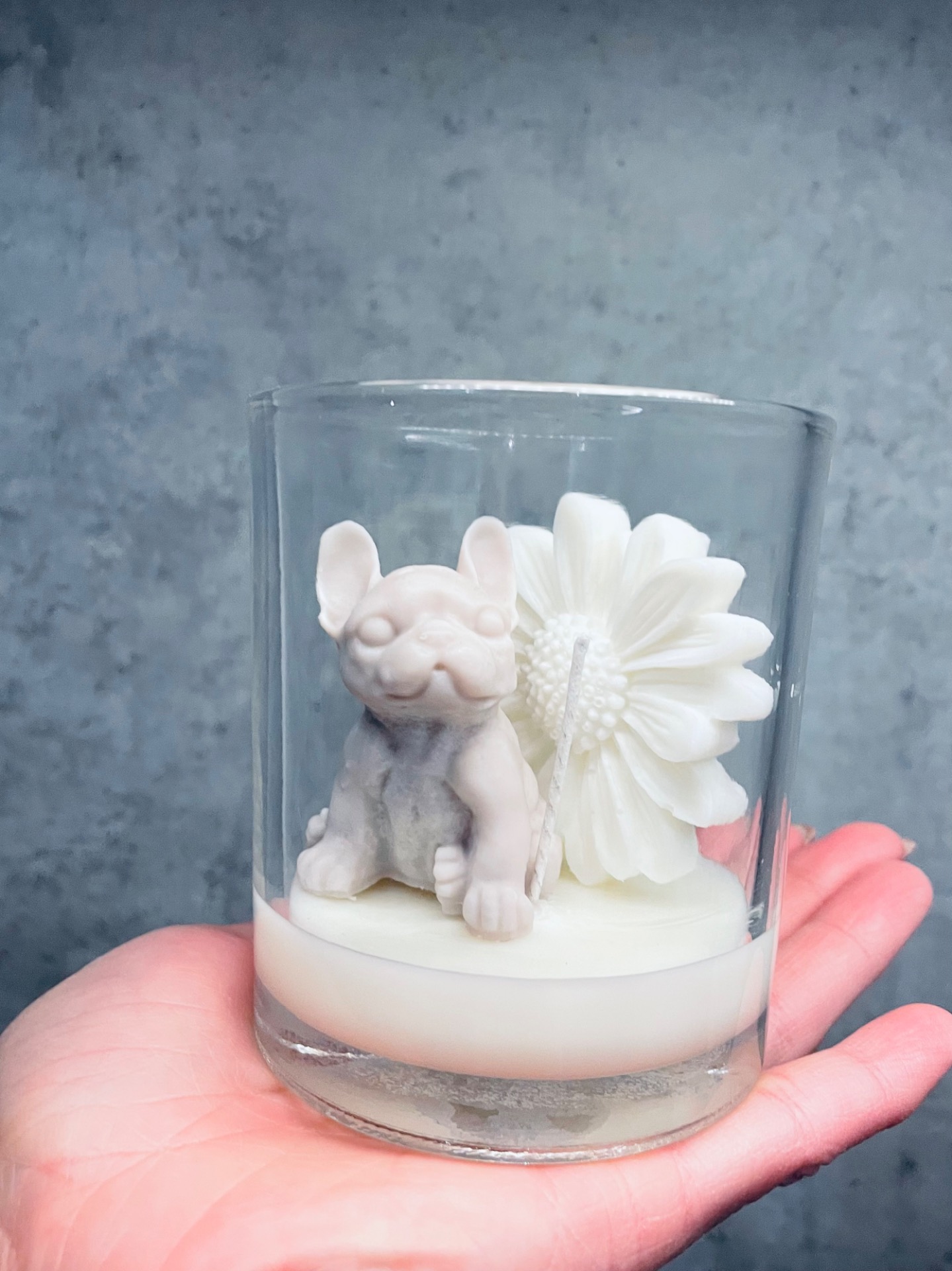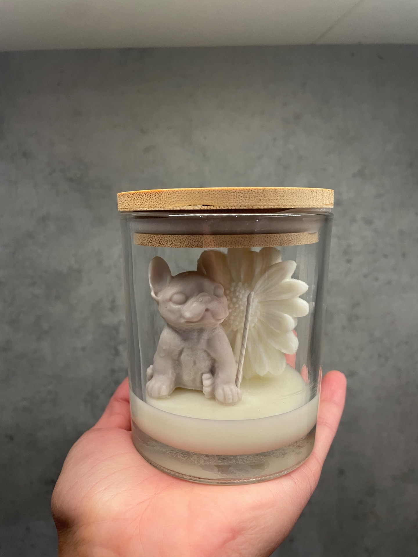 Sojový veganský vosk ve skle s bambusovým víčkem, s dekorací pejska a květiny v odstínu mauve a přírodním odstínu vosku.
